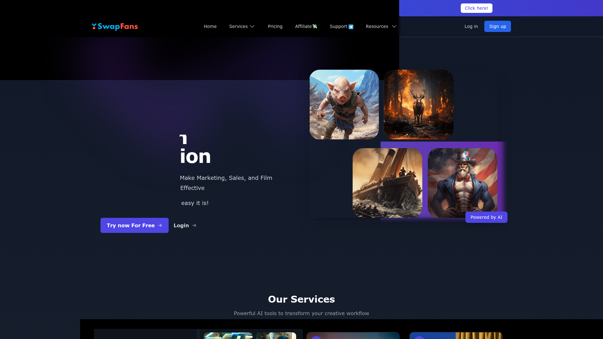 SwapFans: The ultimate Gen AI Platform for Marketing. Easily create viral TikTok and Instagram videos, swap faces, transform backgrounds, and generate stunning images. Perfect for creators and agencies looking to boost engagement. Try it now!