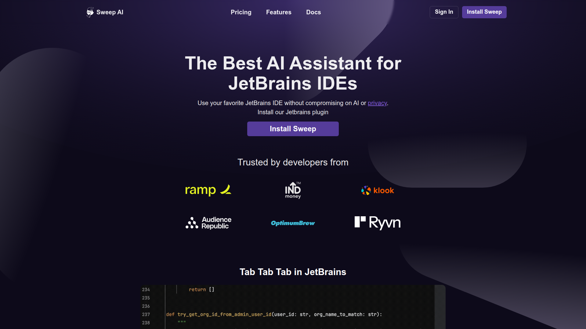 Sweep is the best AI coding assistant for JetBrains. Cursor alternative in JetBrains IDEs., AI coding assistant for JetBrains IDEs including IntelliJ, Android Studio, and PyCharm